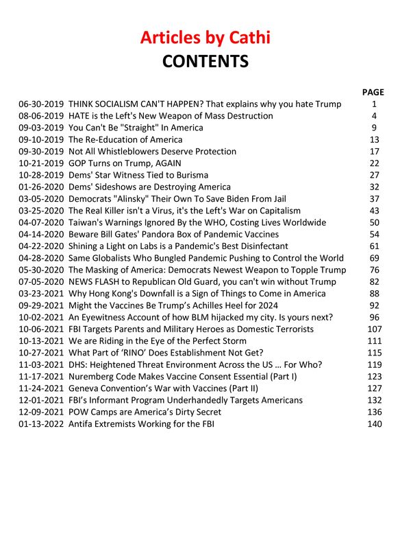 These 28 articles will really have you wondering why you haven't heard some of this news on mainstream media. Written in the same vein as the format of her book, you'll find every article contains a Saul Alinsky tactic, too, to explain how our enemy is operating against us. Complete with sources and methods, Cathi's sharp writing style connecting the dots will not disappoint.