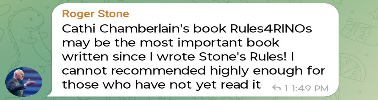 In 2025 Cathi finally slowed down to write her sequel, Rules for RINOs: Tactics for Fighting Republicans in Name Only. The book exposes the war RINOs have declared on MAGA at both local and national levels and promises to provide much-needed tools to render anti-Trumpers irrelevant throughout and after President Trump’s second term. Cathi says it'll be the battle of our lives.
